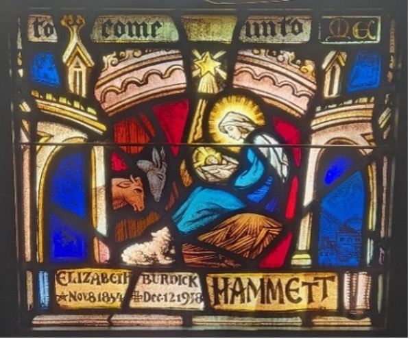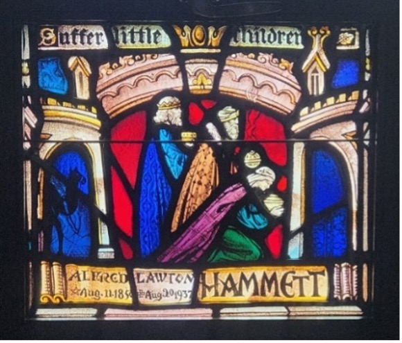 Details of the stained-glass window dedicated to Mr. and Mrs. Hammett. The Bible verse, “Suffer [allow] the little children to come unto me,” recognized their devotion to the Sunday School.